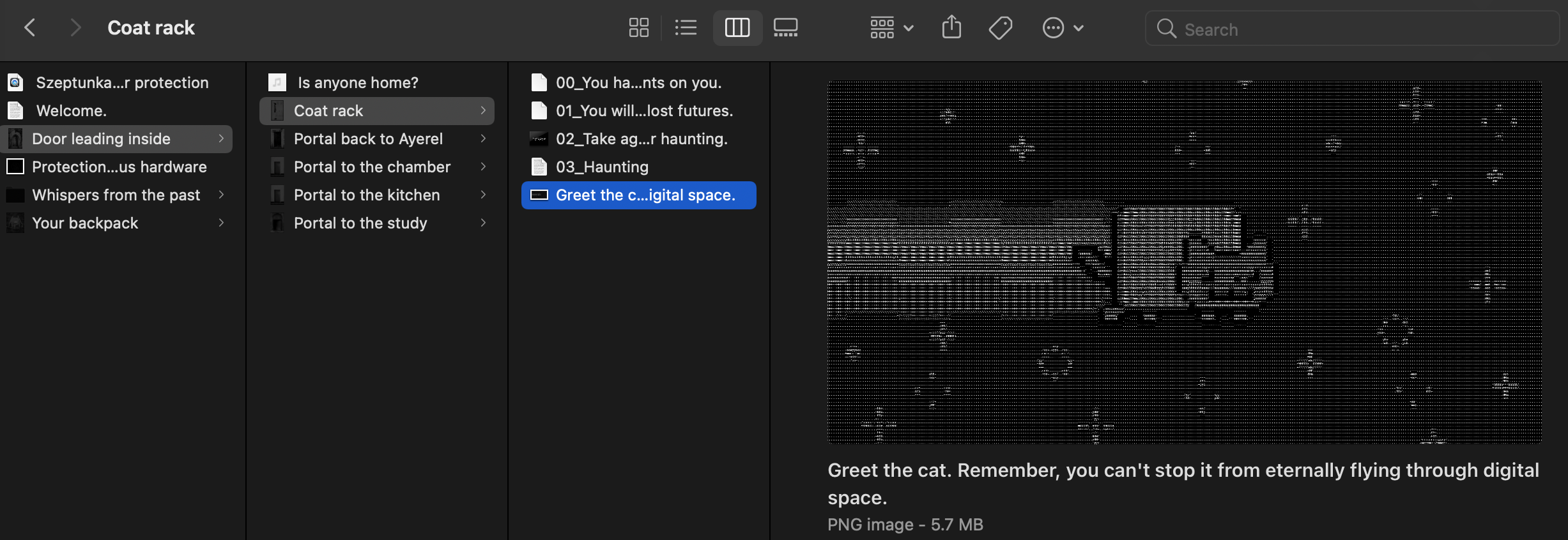 The time-frame of the journey through the archive of Into the Ethereal is dependent on the participant; during audience testing there were participants that took over an hour and ones that took 15 minutes. I believe it became apparent that it is easy to lose yourself and get lost in the amount of content, however each interaction had to have a definite beginning and an end. The intention behind this folder interactive fiction, was to allow the audience to have control over how long they spend investigating and studying this cyber feminist archive. The end of the experience would occur when the participant finds the ‘Portal back to Ayerel’ and encounters the goodbye message and last words. The dialogue between the witch and the audience comes to an end with a text message that outlines the motives and intentions behind this memoir. By stating that “digital technology is something that is not cold, hard, lifeless or unnatural, rather a sensuous, emotive and spiritual extension of ourselves” the narrative intends to convince the audience that digital technology is an assemblage that is mouldable and can be transformed through thought and pure will. This ending message intendes to conclude the experience and remind the audience of the cyber feminist nature of witchcraft, its ability to de-naturalise socio-technical constructs and provide a new way of seeing, knowing and practicing.