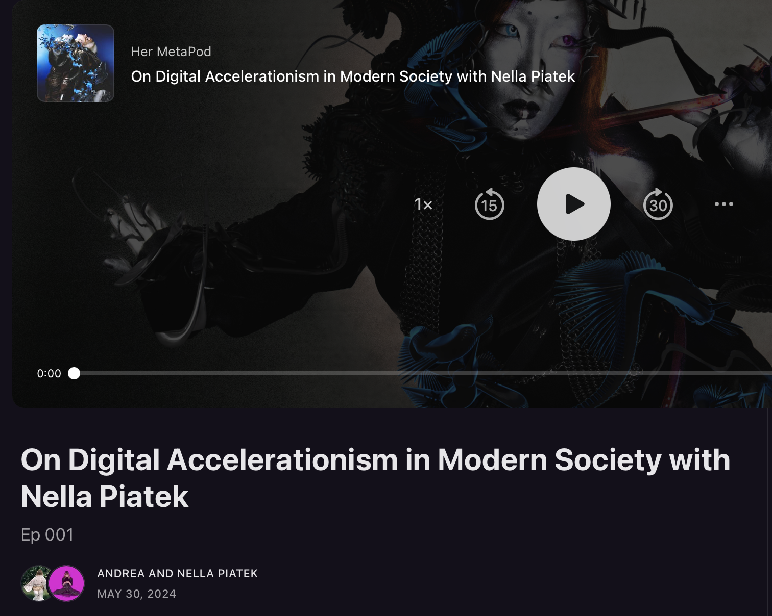 For the first episode of “Just In Her MetaPod”, we are joined with Digital Artist, Future Researcher, And Associate University Lecturer (UAL, Goldsmiths) Nella Piatek. As part of my research on the processes of Accelerationism in Online cultures, I interviewed Nella to learn more about her futuristic creative-cyber practice. The conversation revolves around the impact of technology on society, exploring themes of accelerationism, nihilism, and the blurring of realities. Nella offers a nuanced perspective on accelerationism, while challenging traditional notions of art and technology. We discuss the potential of digital technology to accelerate societal progress and the importance of democratizing art and technology. The conversation also touches on the concept of the cyber witch, a symbol of empowerment and resistance in the digital age. Throughout, Nella and I emphasize the need for creativity and hope in the face of apocalyptic nihilism and doomerism.