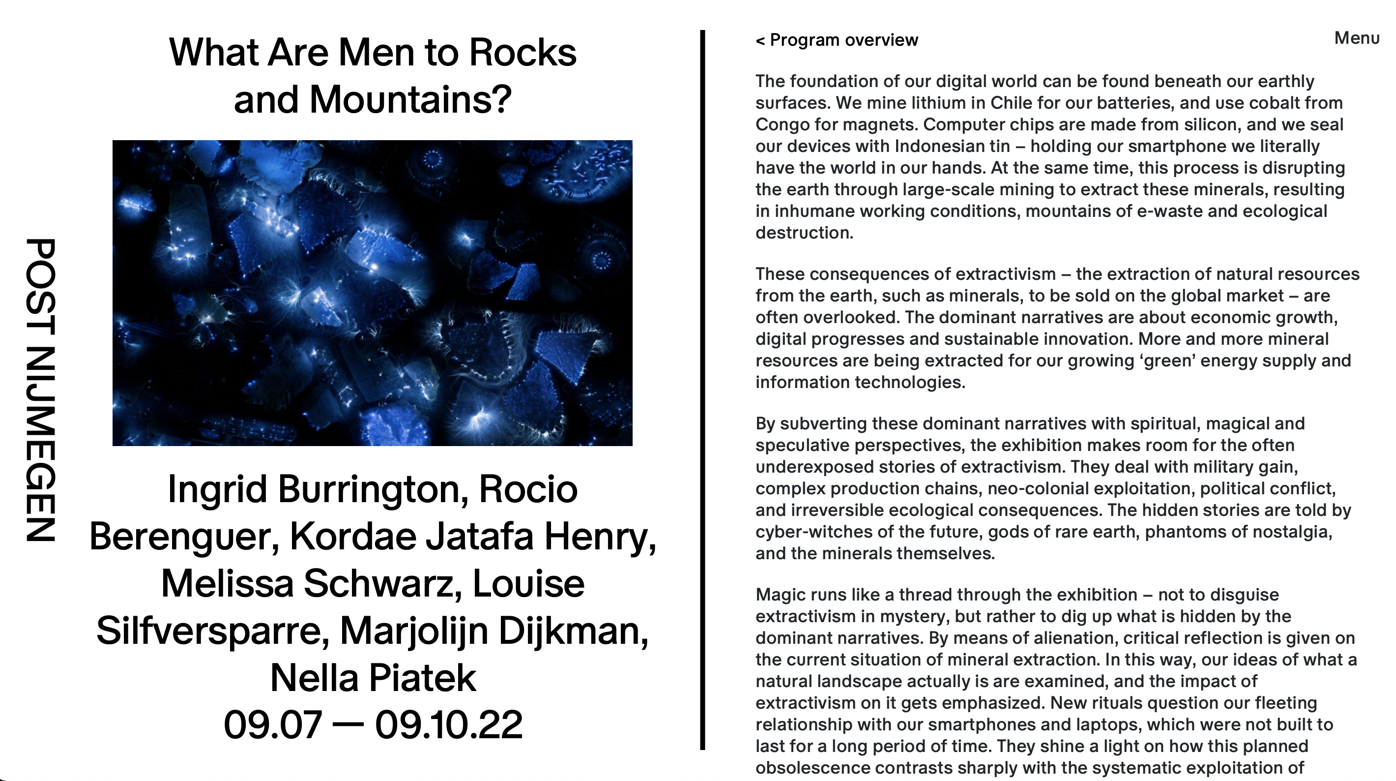 The artworks in 'What Are Men to Rocks and Mountains?' rebel against our endless desire for innovation and control, to which the extraction of minerals is inextricably linked. They regard minerals as independent entities that are given a voice in a world in which Western people are no longer the center of attention. For what are men compared to rocks and mountains?